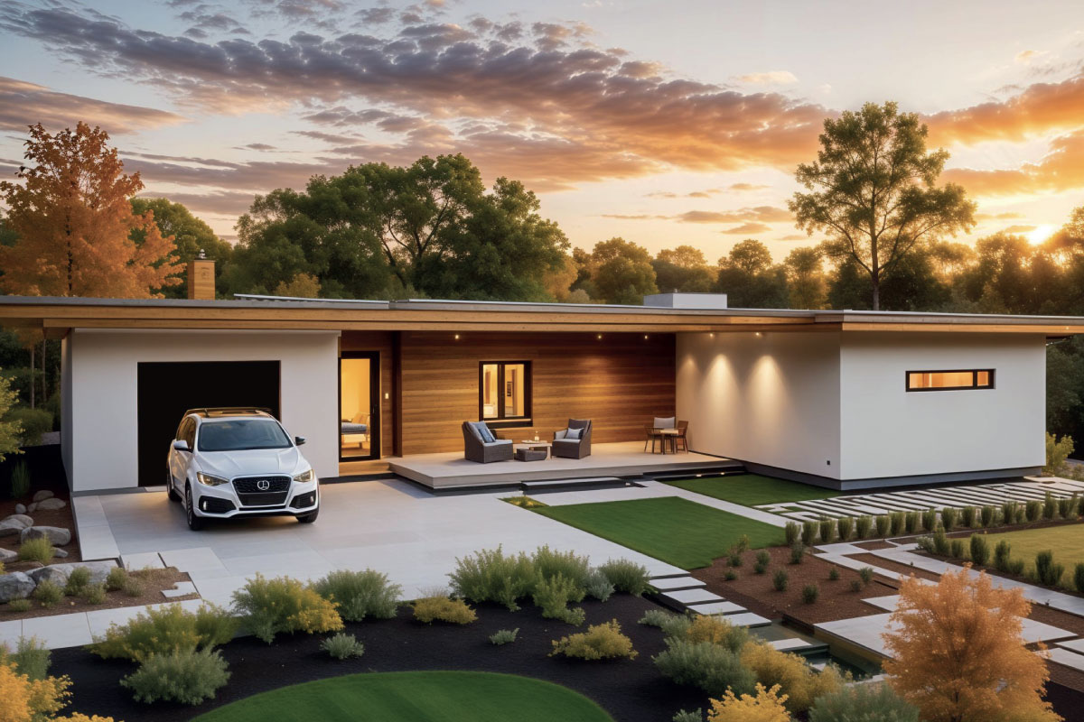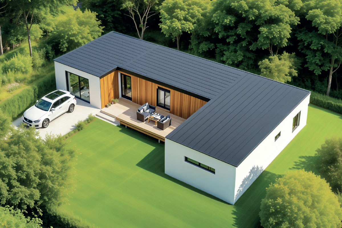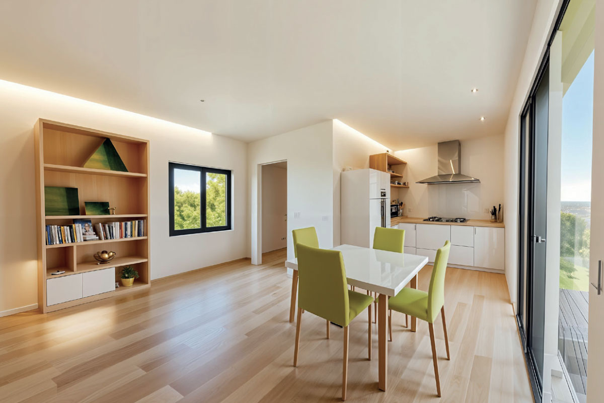 PVC roof, plastic window and door infills, vinyl flooring, plasterboard walls and ceiling, framed interior doors, ceramic floor and wall tiles in the bathroom, Geberit toilet, ceramic washbasin, shower enclosure, wood/render façade, interior and exterior painting, interior and exterior lighting, electrical sockets, electrical distribution board