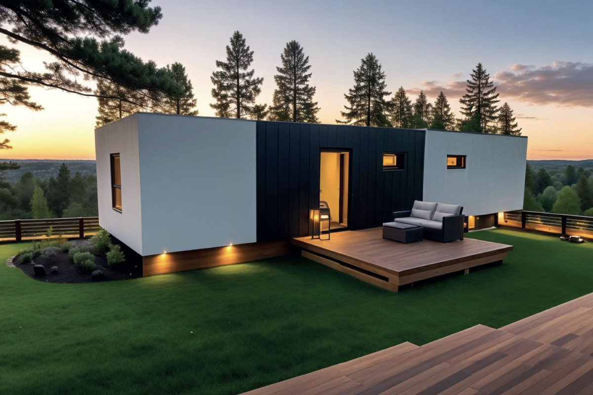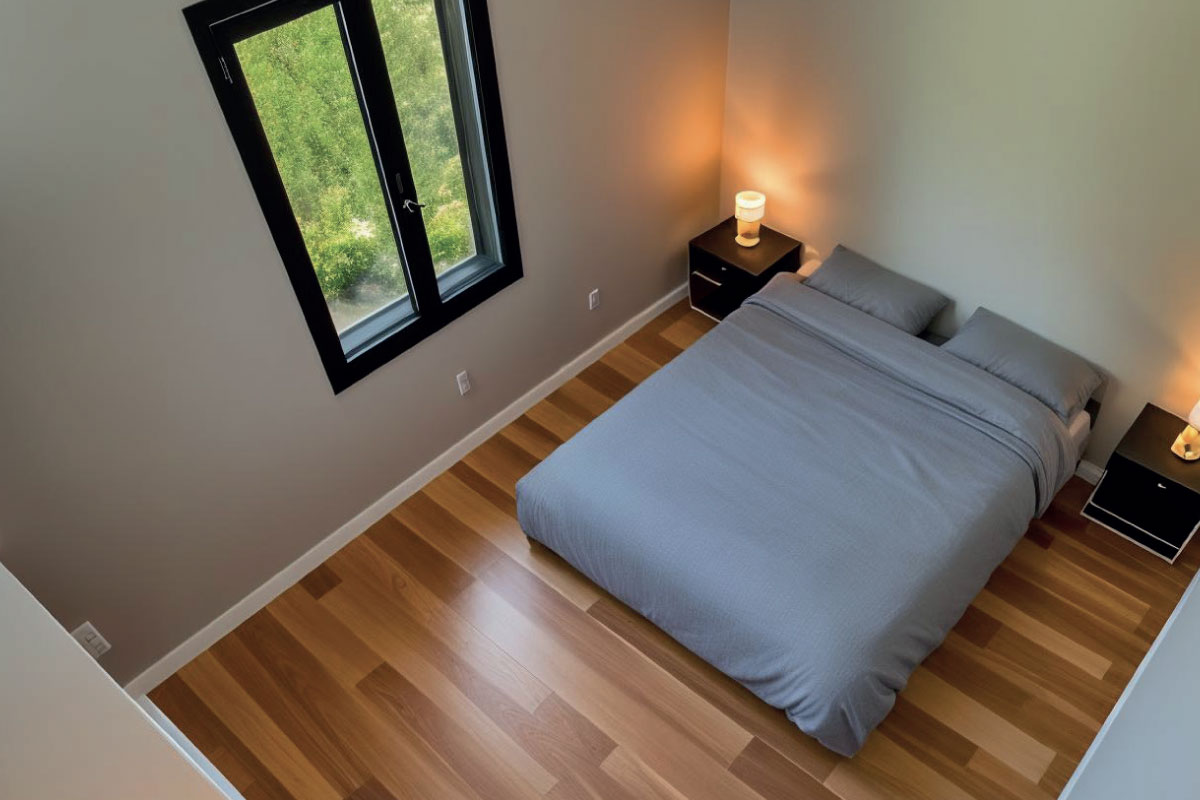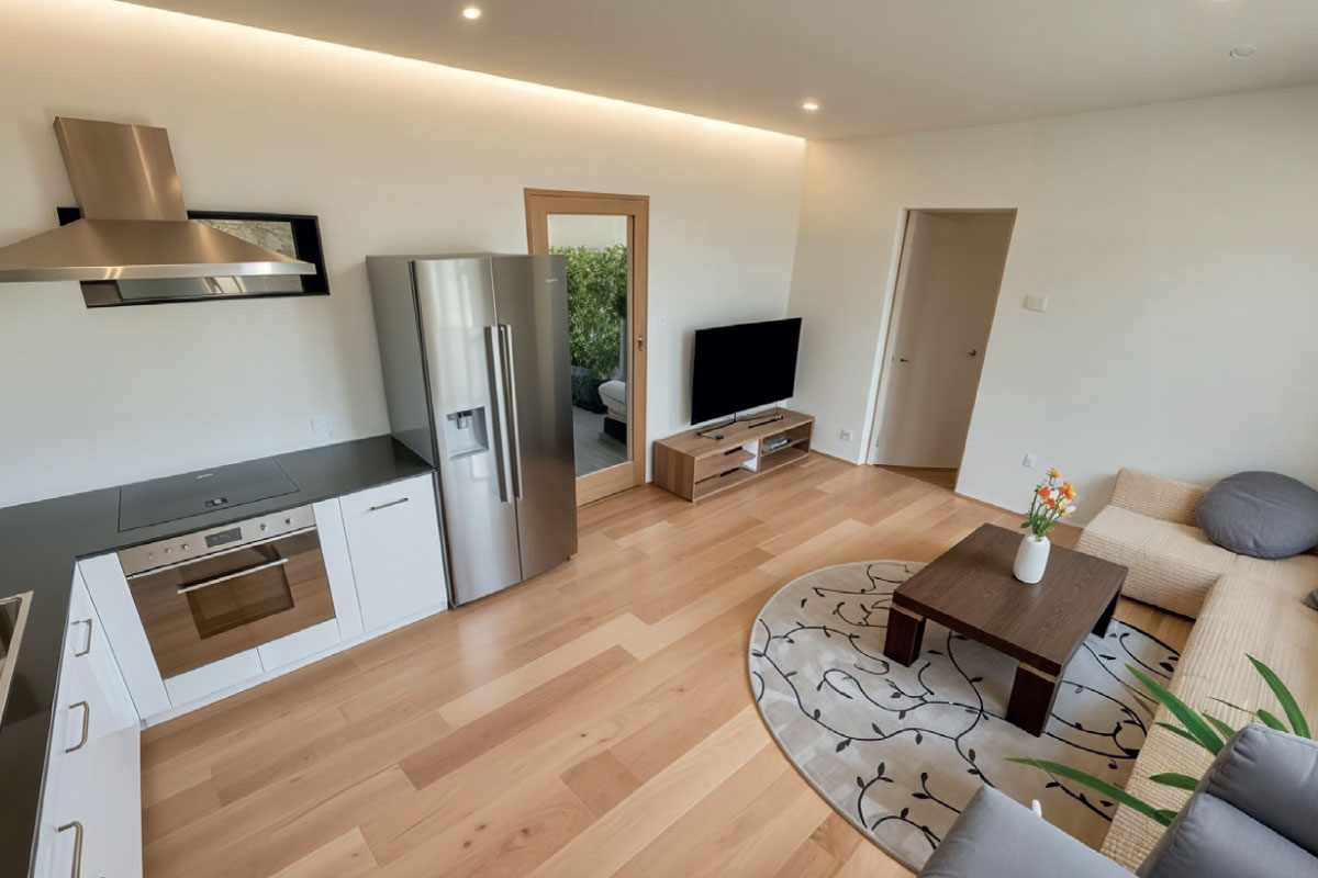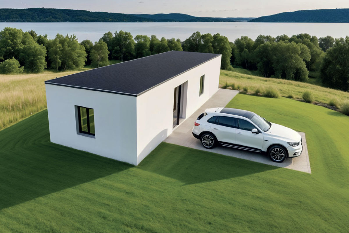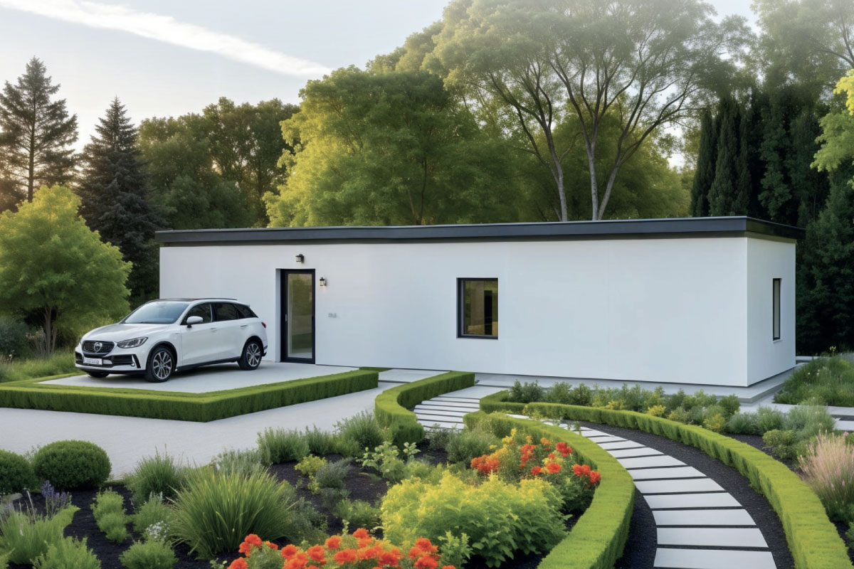 PVC roof, plastic window and door infills, vinyl flooring, plasterboard walls and ceiling, framed interior doors, ceramic floor and wall tiles in the bathroom, Geberit toilet, ceramic washbasin, shower enclosure, wood/render façade, interior and exterior painting, interior and exterior lighting, electrical sockets, electrical distribution board