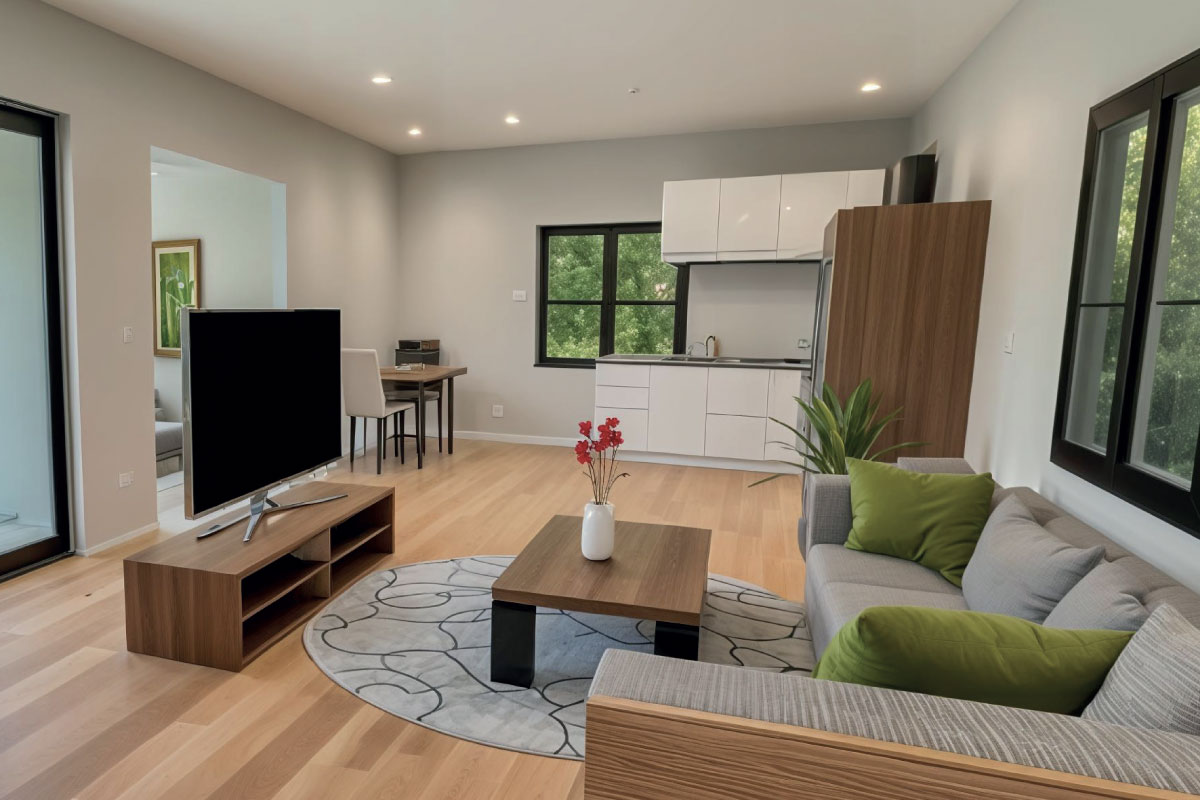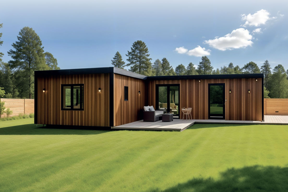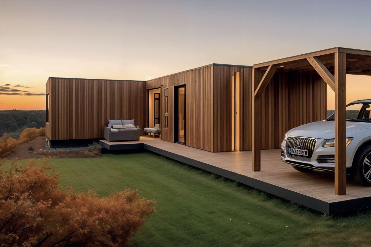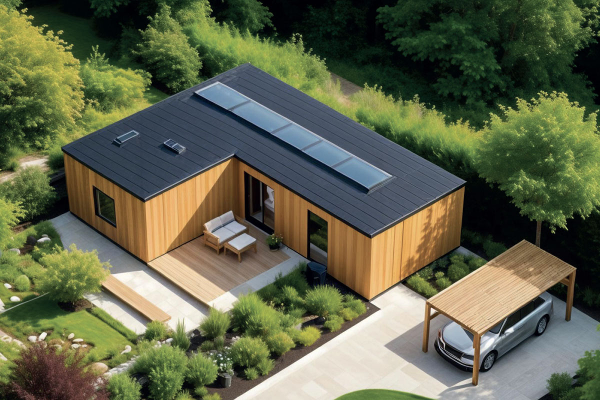 PVC roof, plastic window and door infills, vinyl flooring, plasterboard walls and ceiling, framed interior doors, ceramic floor and wall tiles in the bathroom, Geberit toilet, ceramic washbasin, shower enclosure, wood/render façade, interior and exterior painting, interior and exterior lighting, electrical sockets, electrical distribution board