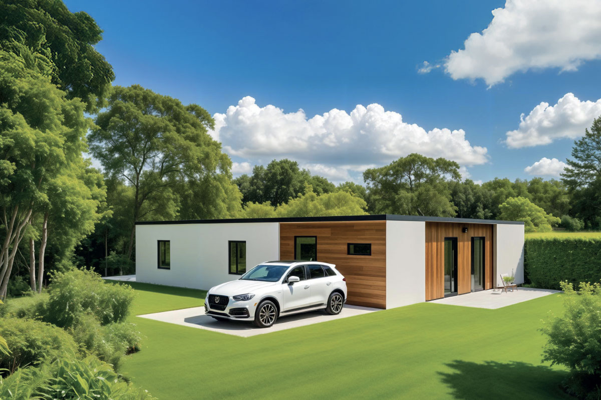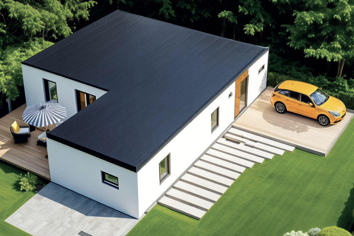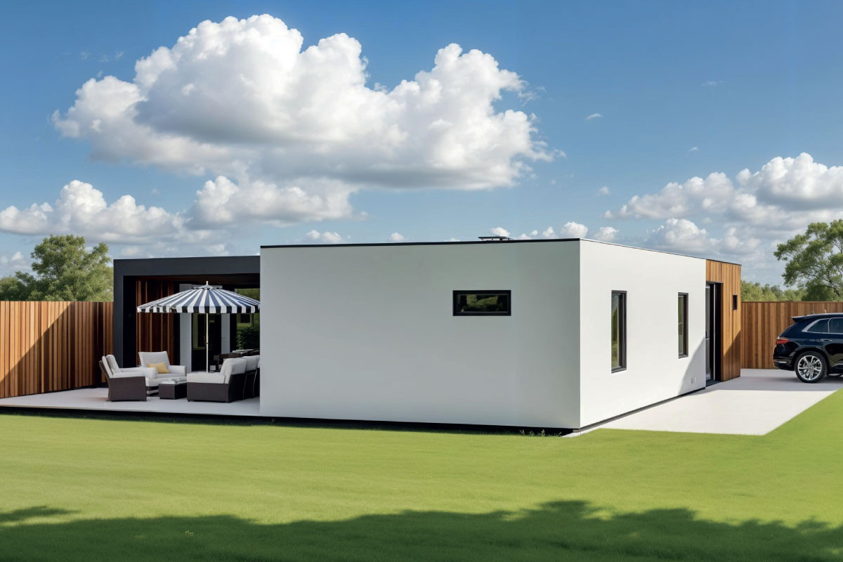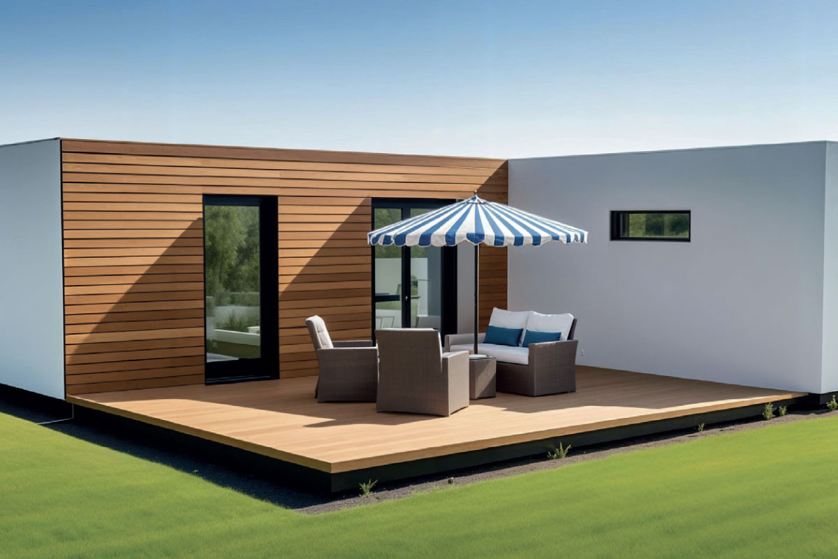 PVC roof, plastic window and door infills, vinyl flooring, plasterboard walls and ceiling, framed interior doors, ceramic floor and wall tiles in the bathroom, Geberit toilet, ceramic washbasin, shower enclosure, wood/render façade, interior and exterior painting, interior and exterior lighting, electrical sockets, electrical distribution board